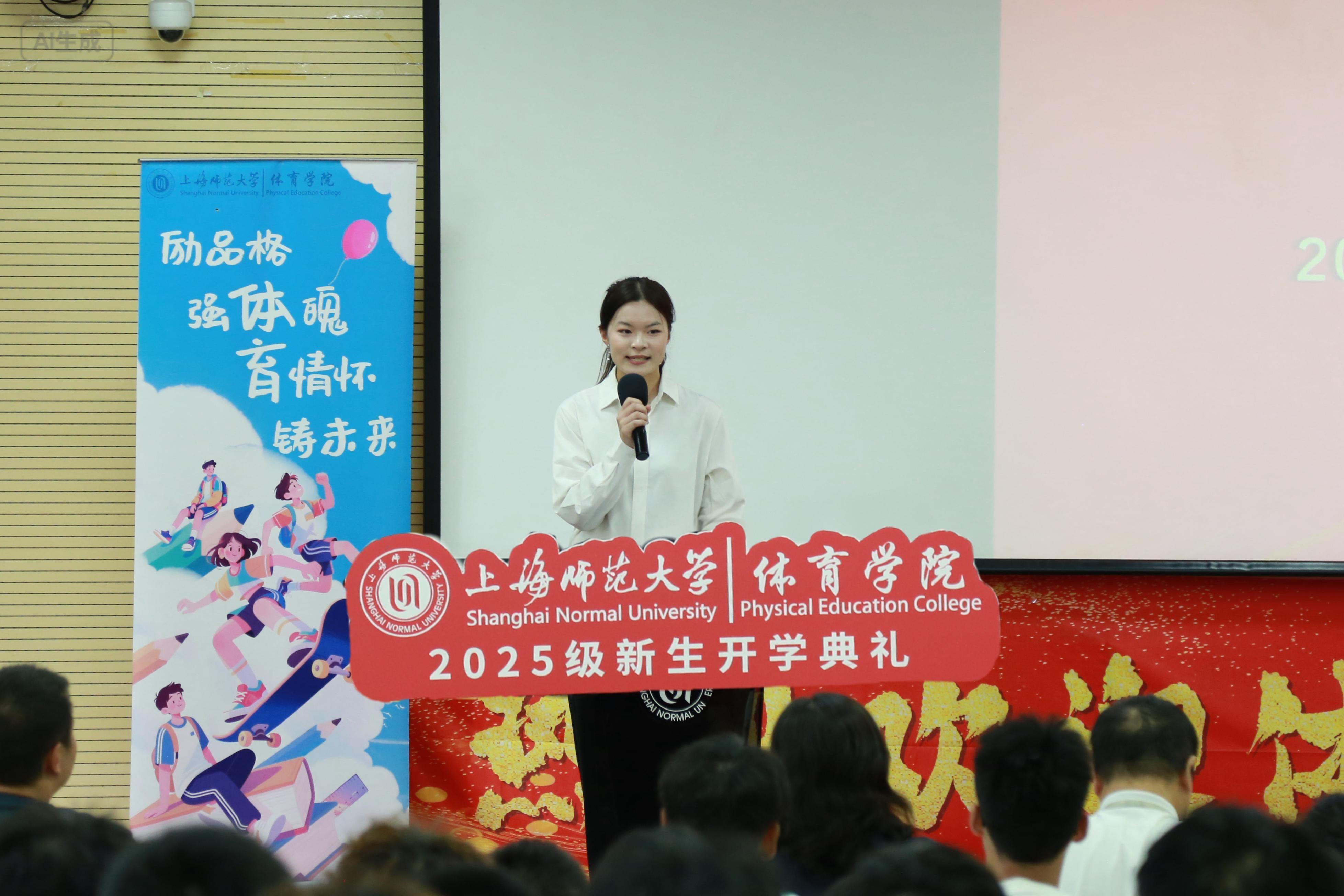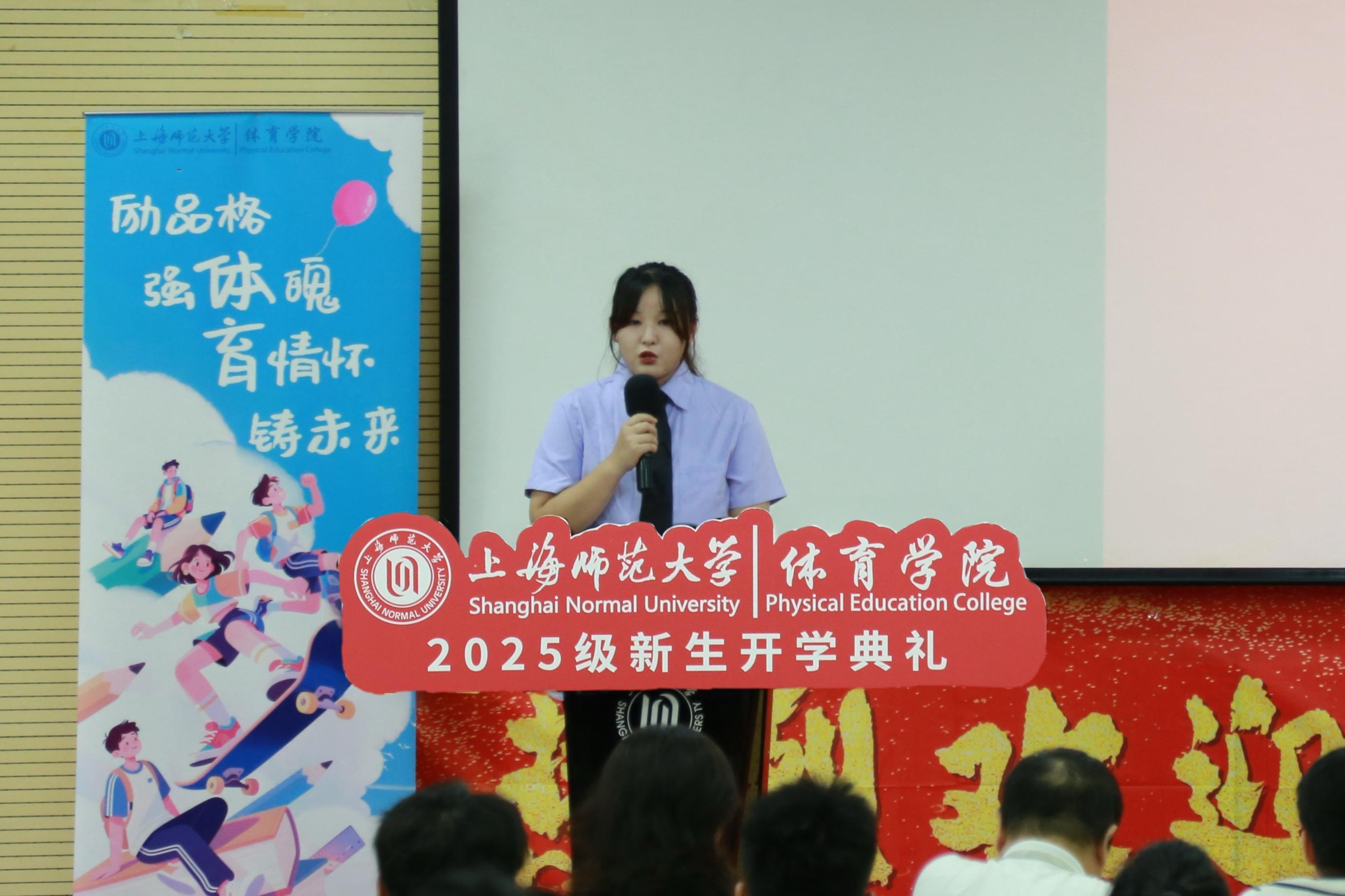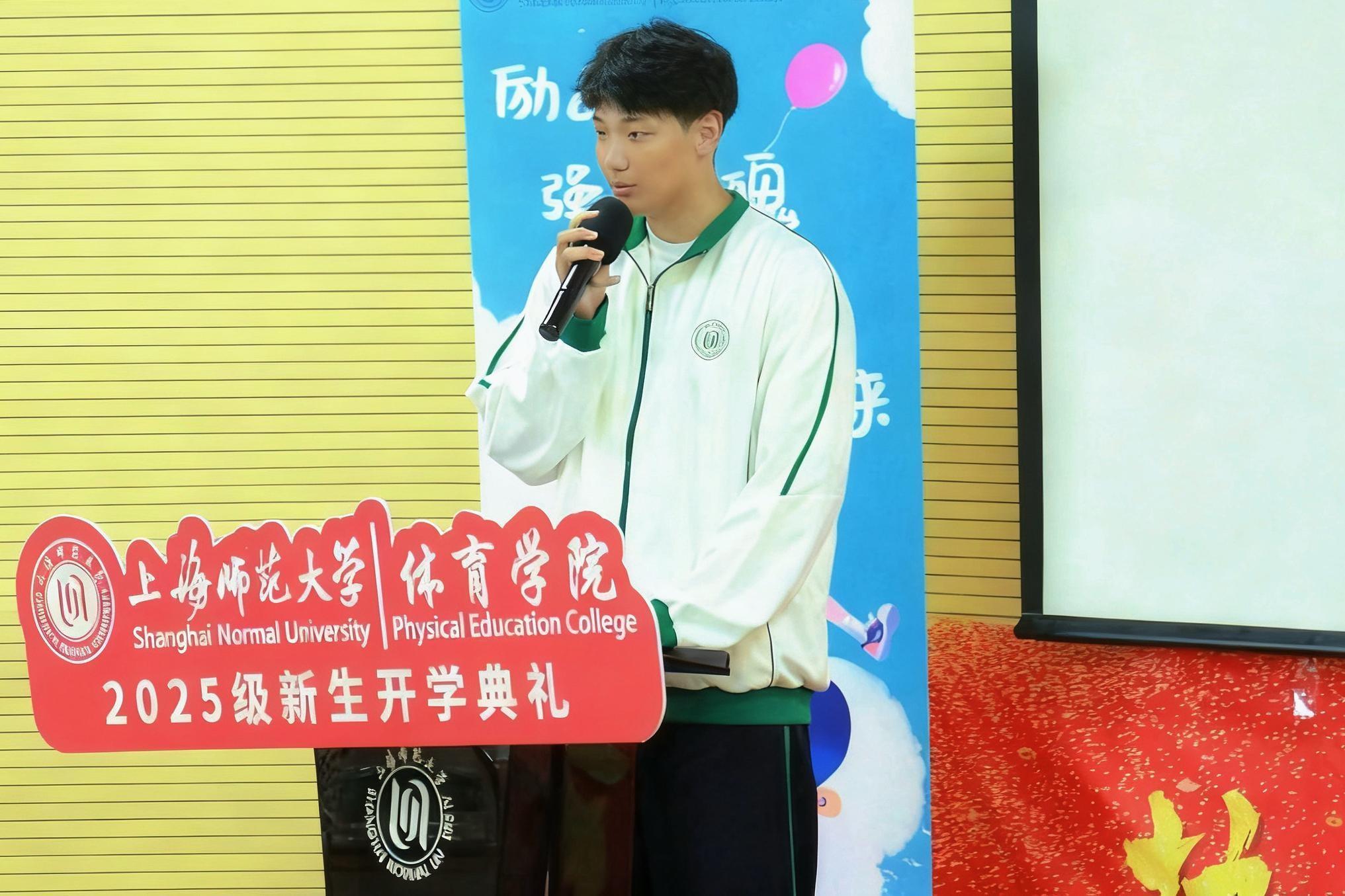 开学典礼在庄严的国歌声中拉开帷幕。2025级运动训练专业曹景淦代表本科新生发言,回顾了军训带给他的身体考验和精神洗礼,他表示,“奖牌会氧化,但淬炼过的灵魂永远闪耀。”要把“更快、更高、更强——更团结”刻进DNA,努力做“能打比赛也能写论文”的新时代体育人。2025级博士研究生沈张逸霏作为研究生新生代表发言,回顾了与科研结缘和在体育学院三年硕士生涯中探索未知的快乐,她表示,要耐得住寂寞,守得住繁华,不断突破自我的边界,实现从仰视科研到平视甚至拥抱科研的蜕变;既要守好擅长,也要敢于突破,勇敢走出自己的路,用扎实的研究为体育强国建设贡献智慧。