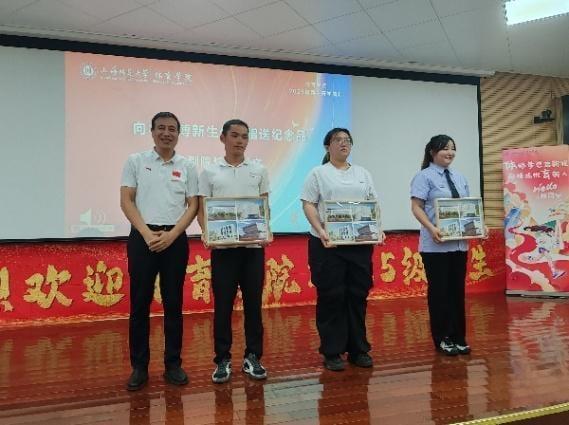 随后,副院长张元文代表学院向本硕博新生代表赠送了由两位本科新生特别绘制的纪念品——由四栋建筑组成的漫画,寓意承载着体育人的共同记忆,面向未来,携手努力。