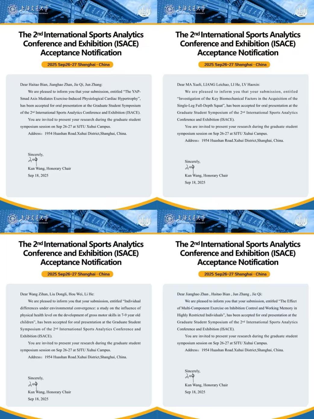 会议期间,四位研究生围绕运动生物力学分析、运动数据分析以及运动表现评估等多个国际前沿领域展开汇报。他们具备扎实的专业基础、严谨的科研素养以及流畅的学术交流能力,赢得了与会专家的高度认可。战江豪同学获奖,既体现了团队的学术实力,也是学院长期重视创新科研训练所取得的成果之一。