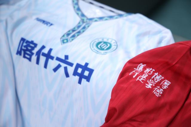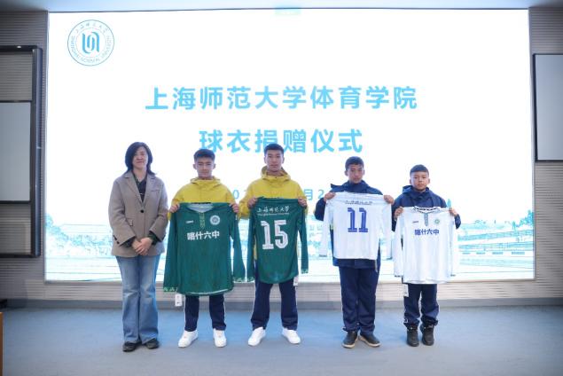 马瑞副院长在定制化装备捐赠仪式上赠予访学团队融合上海师范大学校徽、校训与新疆民族纹样的专业规格比赛服。