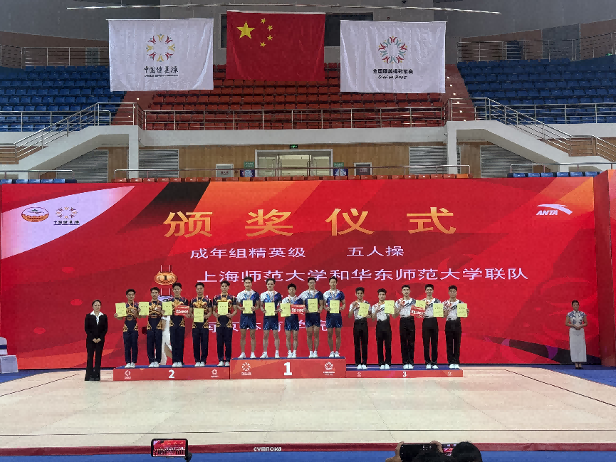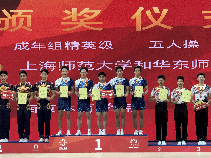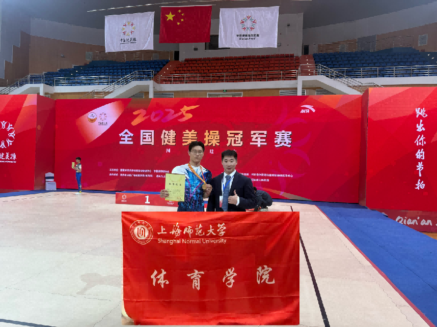 本次比赛我校教师邓枭枭担任赛事裁判员,与我校学生曾泽盛一起前往比赛现场。在这场高手如云的激烈角逐中,上海师范大学学子曾泽盛凭借卓越的实力与不懈的努力脱颖而出。他代表上海师范大学,与华东师范大学的其余四名优秀选手强强联合,组成了一支实力强劲的联队。赛场上,他们默契配合、动作行云流水,每一个跳跃都充满力量,每一次配合都精准无误,将健美操的魅力展现得淋漓尽致。最终,成功斩获“成年组精英级五人操”冠军。曾泽盛也凭借在此次比赛中的出色表现,实现了从国家二级运动员到国家运动健将的华丽晋升,为上海师范大学获得第一枚健美操项目的全国金牌,也为个人运动生涯添上了浓墨重彩的一笔。